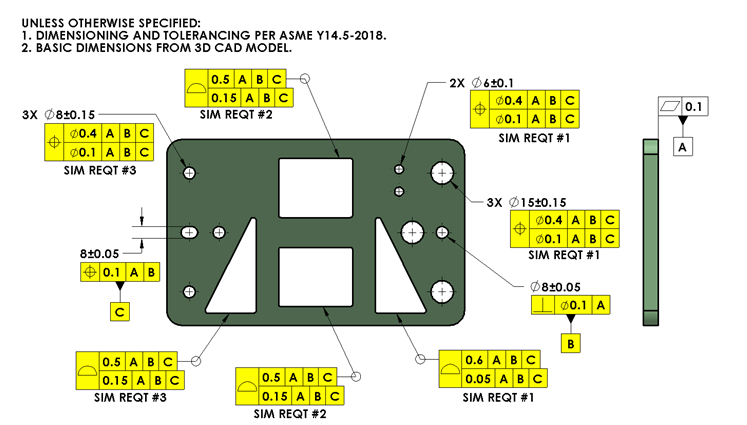 As shown in the drawing below, placing SIM REQT #1 beneath the applicable feature control frames tells everyone those lower segments form one group to be inspected together, as a larger pattern. What began as seven groups might now become five in the drawing below. Additional notes, like SIM REQT #2 or #3, can define other groups of features that each form a larger pattern, as needed to meet the functional requirements of the part. So, for the drawing shown below, there are three FRTZFs, instead of seven.