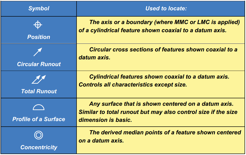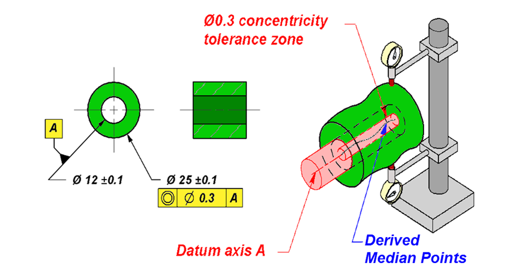 When no modifiers are present, the implied condition is regardless of feature size as shown below. In this case, the axis of the datum feature and the feature being controlled must be determined to find the error in coaxiality. Although this control may be applied to bearings and dynamic balance applications, the job can usually be accomplished at a lower overall cost by using one of the runout controls.