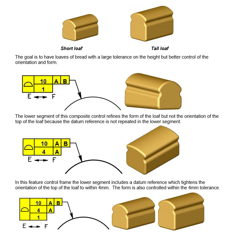 Here the upper segment controls the location of the top of the loaf to within 10mm. The second segment tightens up the orientation relative to A within 4mm. The third segment controls the shape of the top of the loaf to within 1mm.