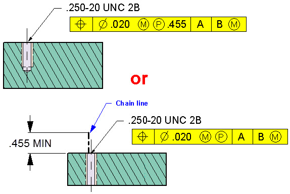 The symbol is placed in the feature control frame as of the 1994 Standard. Prior to this, the symbol was placed in a separate frame under the feature control frame. The amount the tolerance is projected is usually written next to the symbol. For clarity the direction and height of the projected tolerance may be indicated with a heavy chain line drawn closely adjacent to an extension of the center line of the hole.