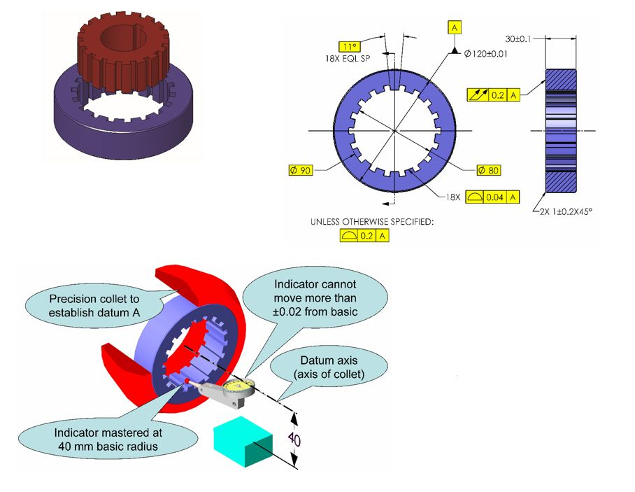Last month’s Tip shows how using profile of a surface can increase allowable tolerance without affecting the function of a part. The original drawing used a size dimension and tolerance plus total runout to control the 18 teeth on the Cutter Ring. Making the size dimension basic and using profile of a surface allows both size and location to be inspected at the same time.