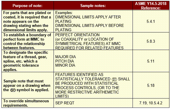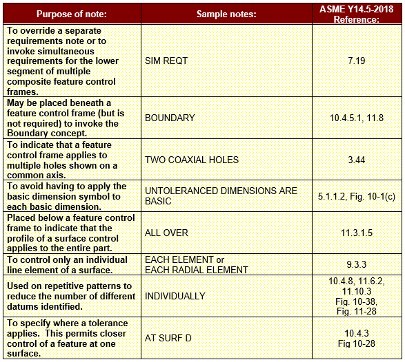GD&T has greatly reduce the notes, in English, that are needed on the field of the drawing. There are still, however, a few notes that may be required to supplement GD&T. There have been requests to gather the notes found in ASME Y14.5-2018 to provide a quick reference. The following is a table of the notes found in the Standard along with a brief explanation of their purpose and a reference to where you can learn more about their use. You might want to keep this tip close by as a handy reference.