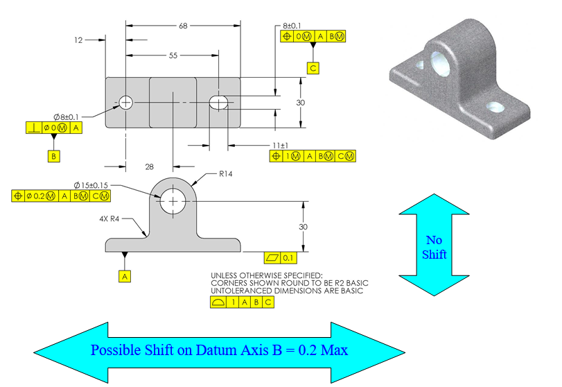 Referencing a datum feature at MMB or LMB does not change the tolerance on the feature(s) being toleranced. These modifiers, however, may allow the part to float or shift relative to the datum reference frame. Notice that the 15mm diameter hole references both B and C at their MMB. Therefore, if both B and C are produced at their MMB, there is no shift of the datum feature relative to the datum reference frame established by A, B and C. If, however, datum feature B happened to be produced at 8.1 (its LMC size) and was perfectly perpendicular to the primary datum, the part could shift as much as 0.2mm total, relative to the datum reference frame. In other words, the part could be slid left or right 0.2mm total while maintaining contact with datum A in order to bring the 15mm hole into its allowable position tolerance zone. Some inspectors treat this 0.2mm shift as an additional bonus tolerance on the 15mm hole which would allow additional deviation in all directions. This would be incorrect since no movement of the part is allowed perpendicular to the primary datum.