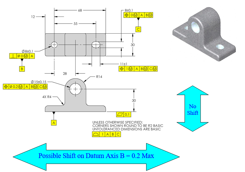 Referencing a datum feature at MMC or LMC does not change the tolerance on the feature(s) being toleranced. These modifiers, however, may allow the part to float or shift relative to the datum reference frame. Notice that the 15mm diameter hole references both B and C at their MMC. Therefore, if both B and C are produced at their MMC, there is no shift of the datum feature relative to the datum reference frame established by A, B and C. If, however, datum feature B happened to be produced at 8.1 (its LMC size) and was perfectly perpendicular to the primary datum, the part could shift as much as 0.2mm total, relative to the datum reference frame. In other words, the part could be slid left or right 0.2mm total while maintaining contact with datum A in order to bring the 15mm hole into its allowable position tolerance zone. Some inspectors treat this 0.2mm shift as an additional bonus tolerance on the 15mm hole which would allow additional deviation in all directions. This would be incorrect since no movement of the part is allowed perpendicular to the primary datum.