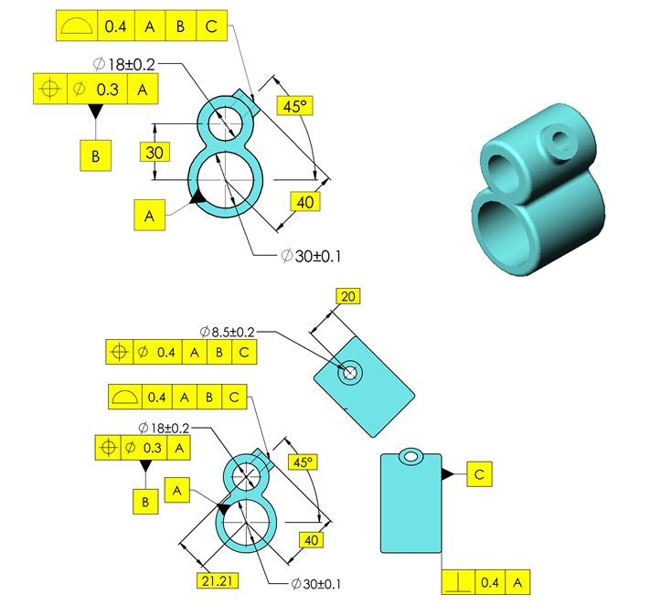 I received a comment on last month’s Tip regarding the placement of dimensions on the drawing. Specifically, the issue was the 30 BASIC dimension. Notice on the revised drawing that the 30 has been replaced by the 21.21 BASIC dimension at the 45° angle. The comment came from someone who inspects parts. His point was that in order to inspect the part, he would have to calculate this dimension. The actual part definition and tolerance have not changed. Since inspection receives and must use the print, they are design’s customer. Why not satisfy the customer by giving them what they need if the actual requirements do not change? It is always good design practice to review dimensioning schemes with all stakeholders.