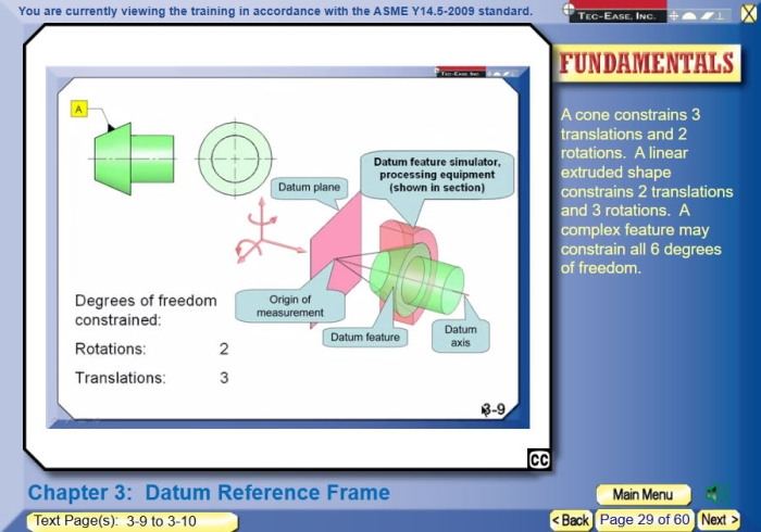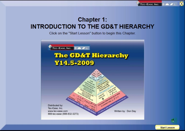 The GD&T Hierarchy Coach teaches Fundamentals of GD&T and is based on Don Day's popular text book, The GD&T Hierarchy. This program is in accordance with the ASME Y14.5-2009 standard with additional coverage of former practices in the ASME Y14.5M-1994.